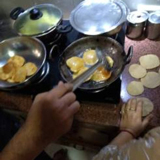 Ein typisches Gericht am Diwali – Tag ist Kartoffelgemüse und “Puri”. Puri ist ein salziger Snack, der in Öl herausgebacken wird. Dafür wird ein Chapati-Teig aus Mehl, Grieß, Gewürzen, Ghee und Wasser bereitet und zu kleinen Fladen ausgerollt. Auch geschickte, kleine Hände können dabei schon mithelfen!